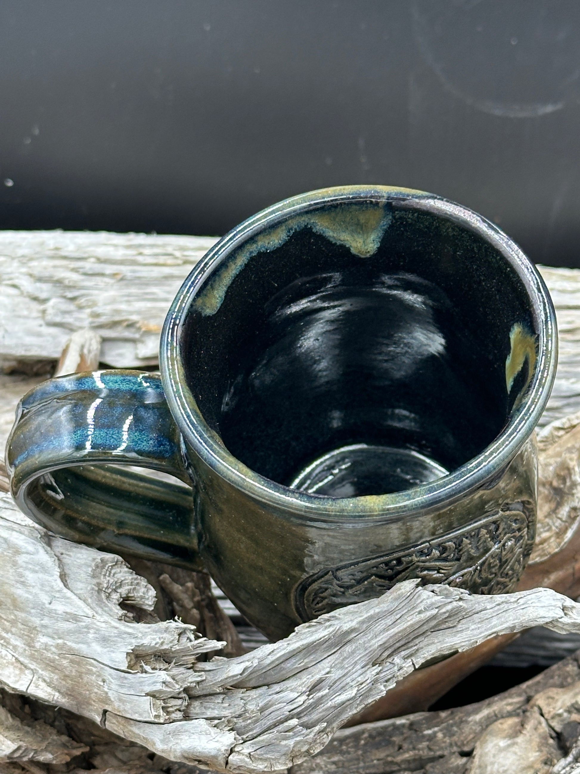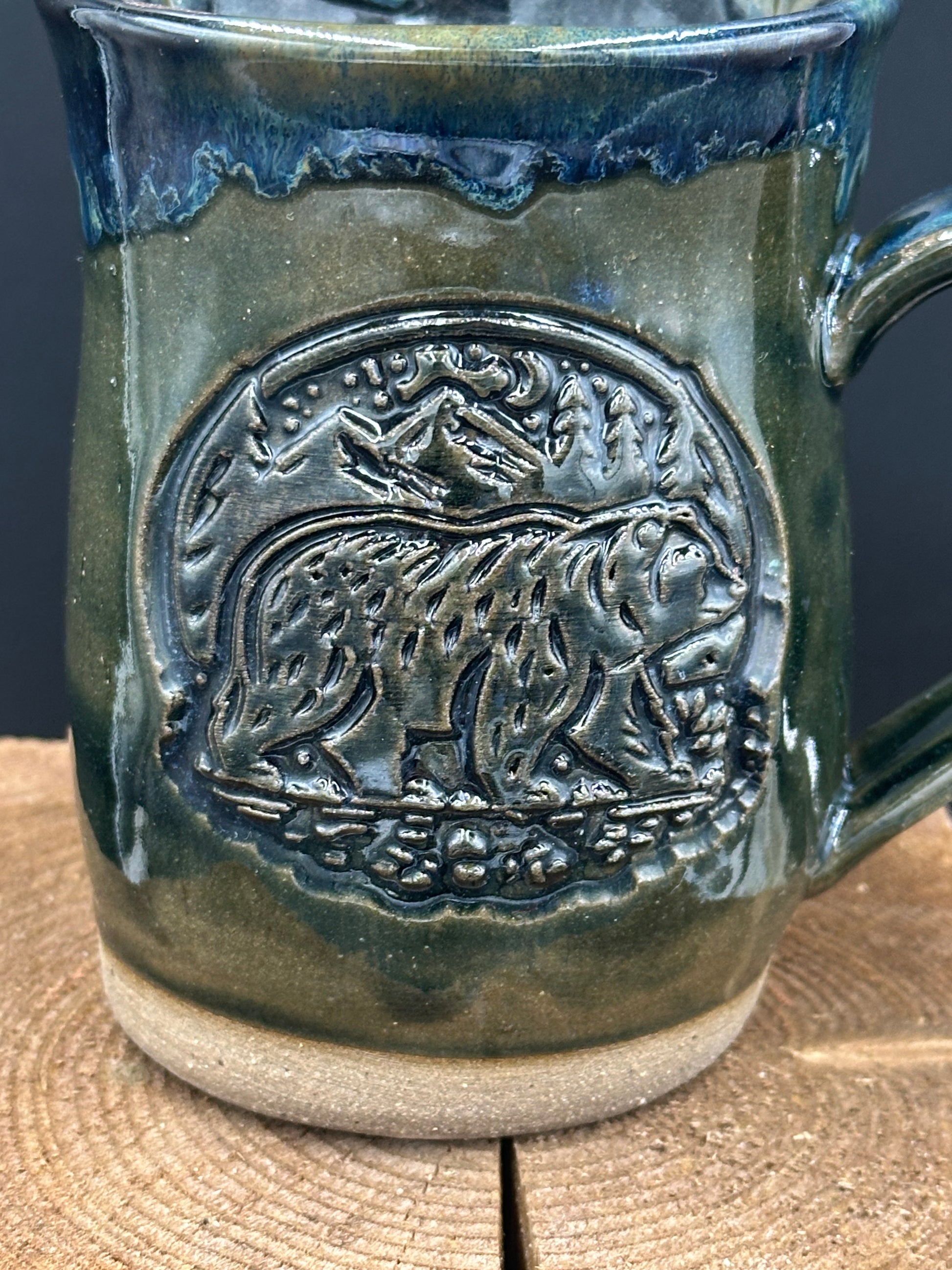 Bear in the Woods Dark Mottled Green Pottery Mug/Cup approximately 16 ounces (M0112)