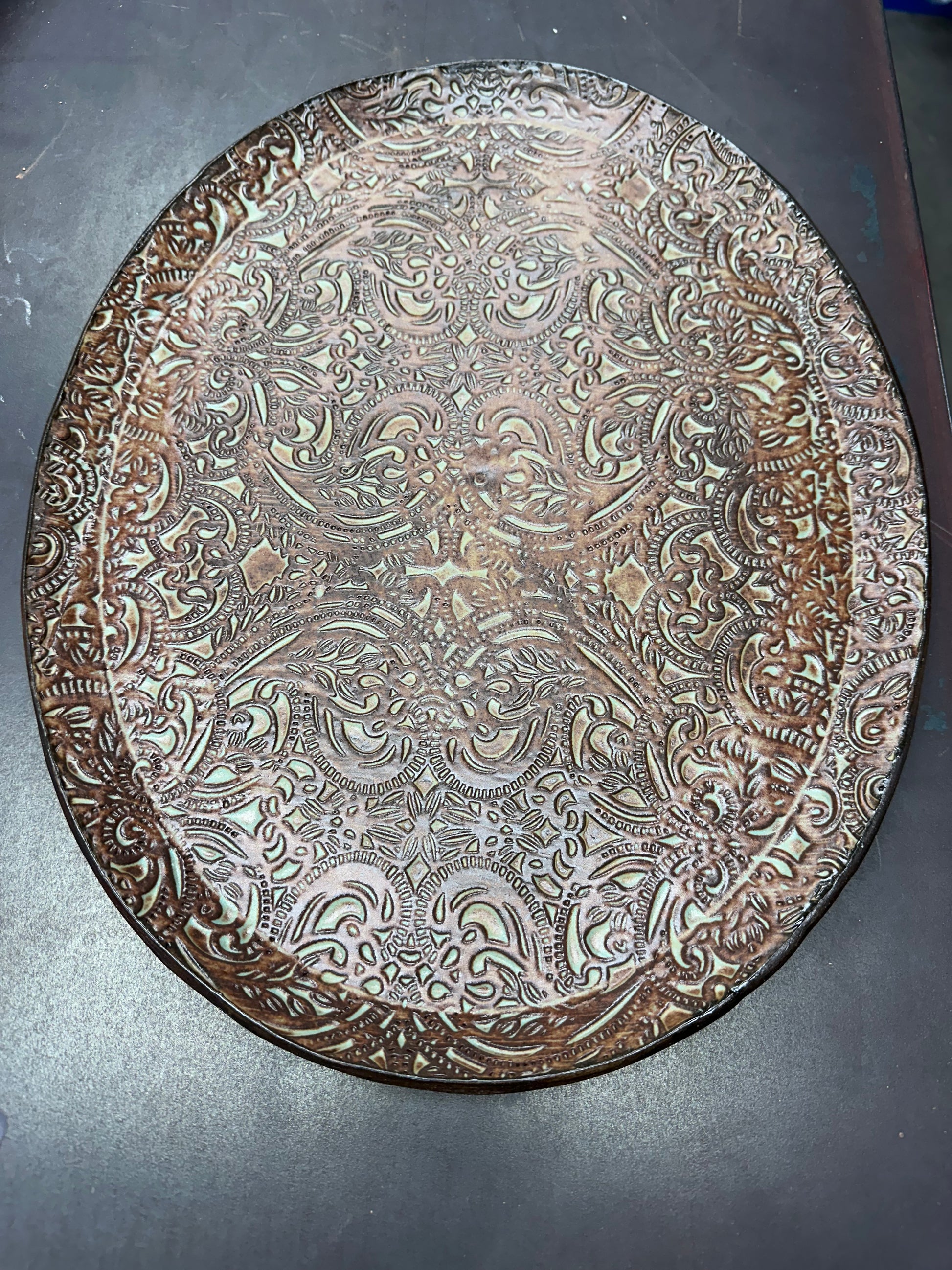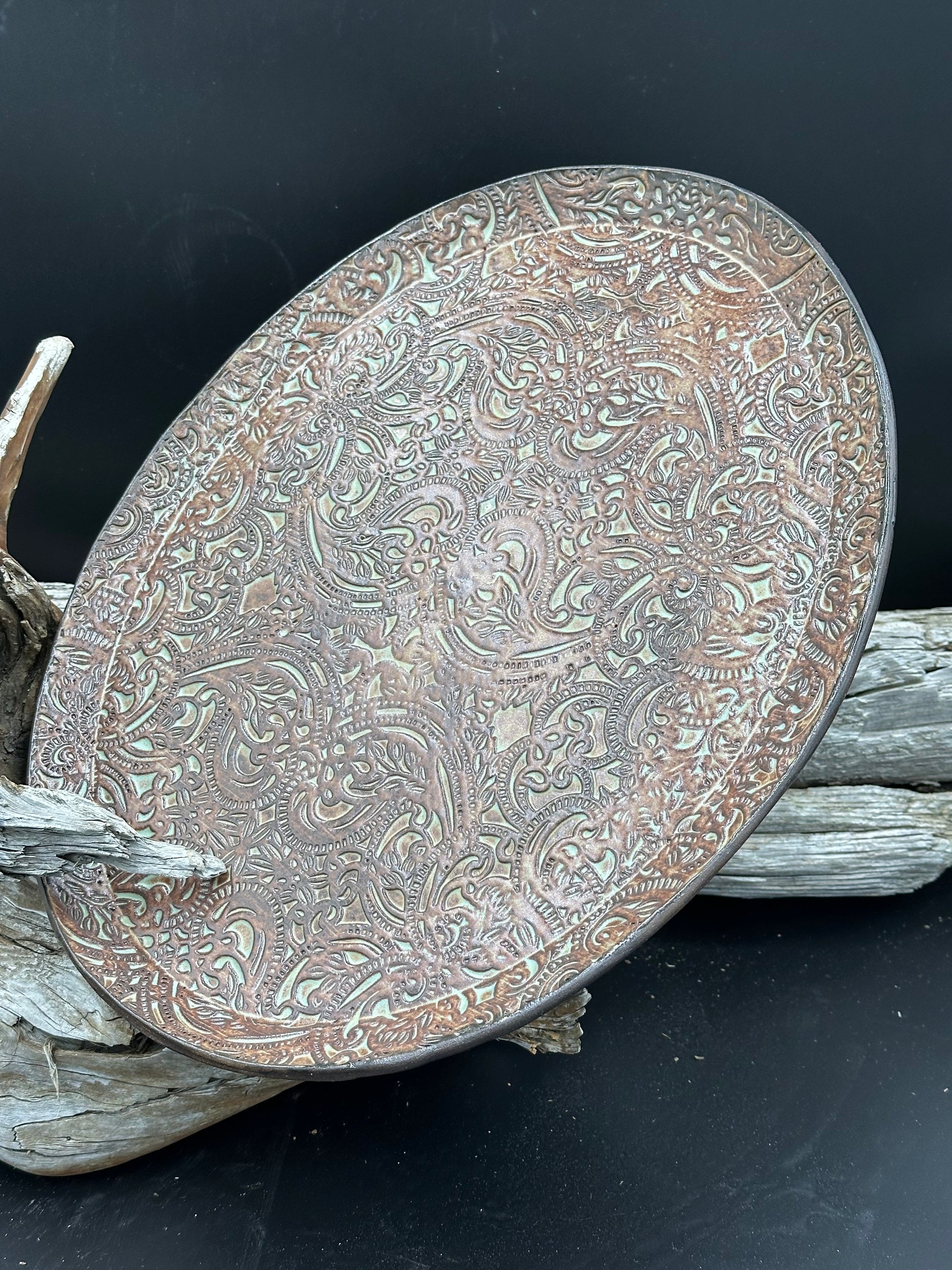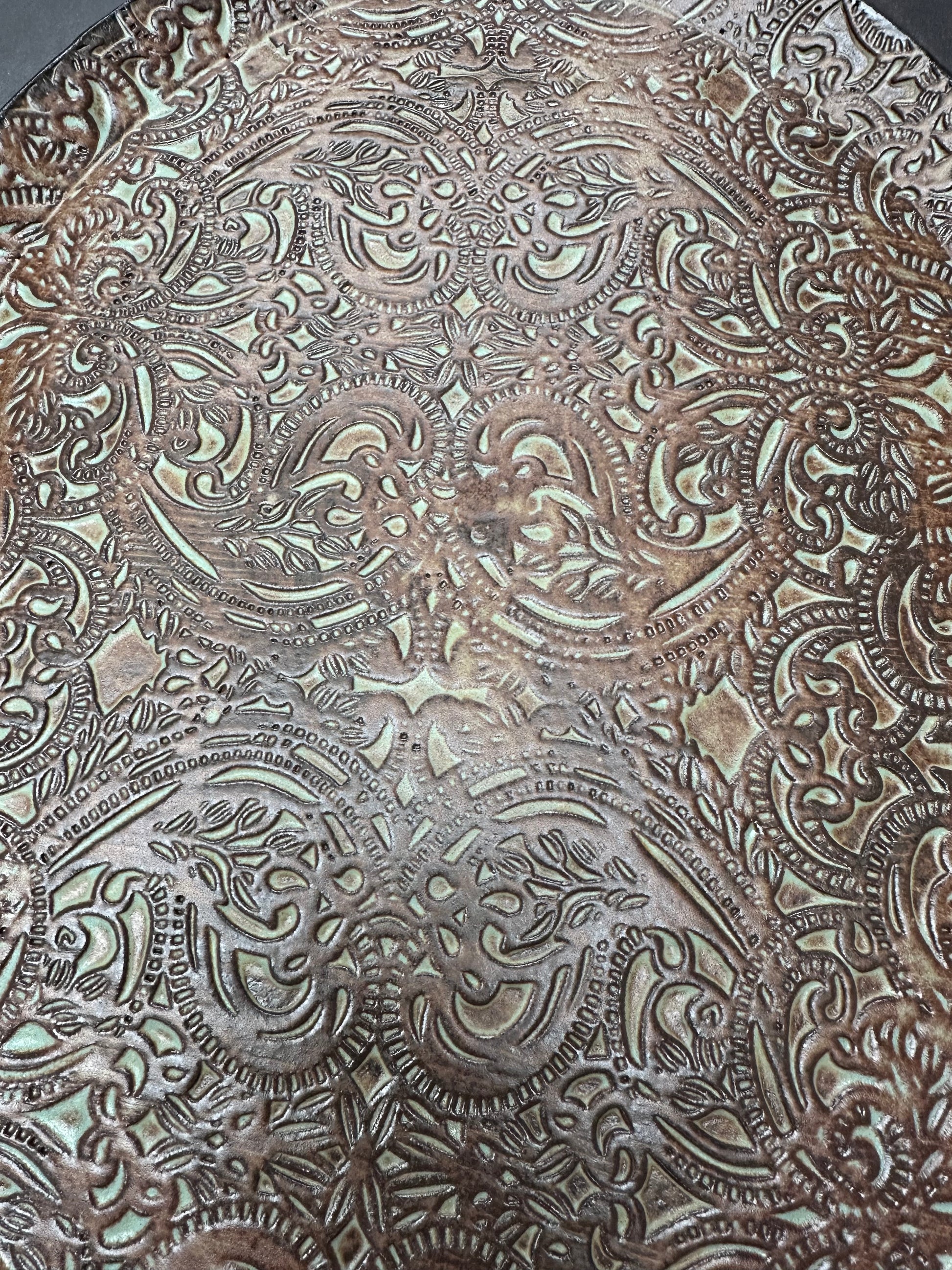 This rustic and elegant Large Serving Platter is a beautiful addition to any dining table. The sage green and brown textured design adds a touch of ornate charm, while the 12"x15" size offers ample space for serving dishes. Bring a touch of sophistication to your meals or entertaining with this stunning platter.