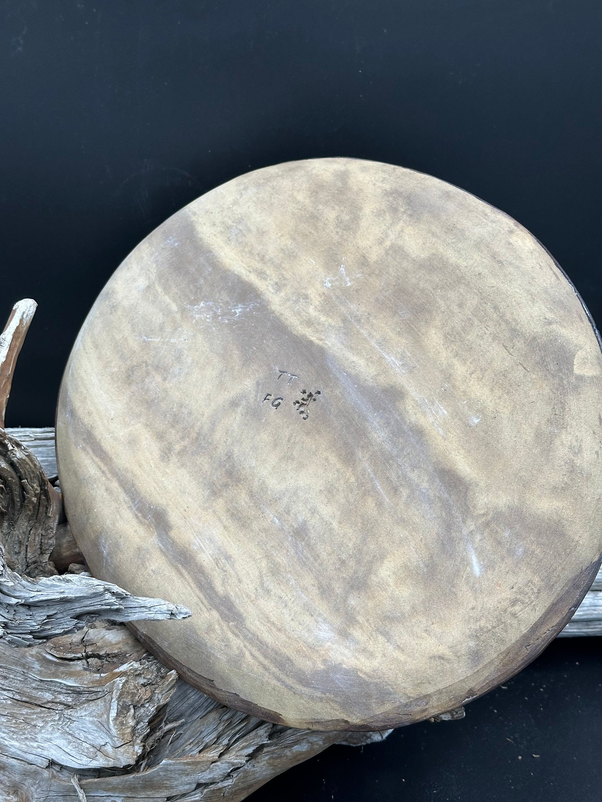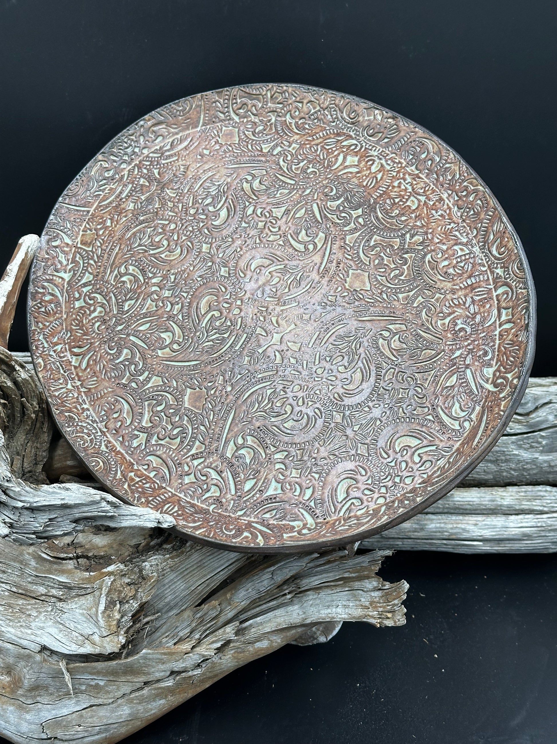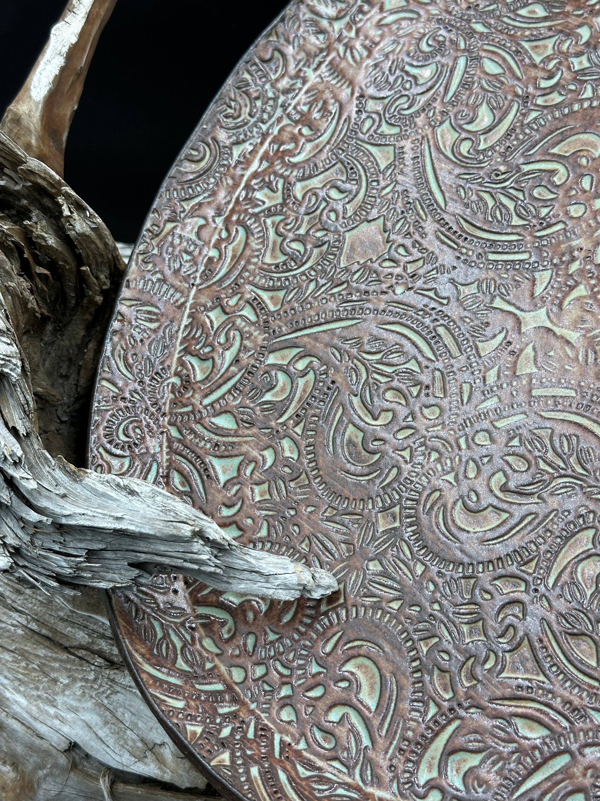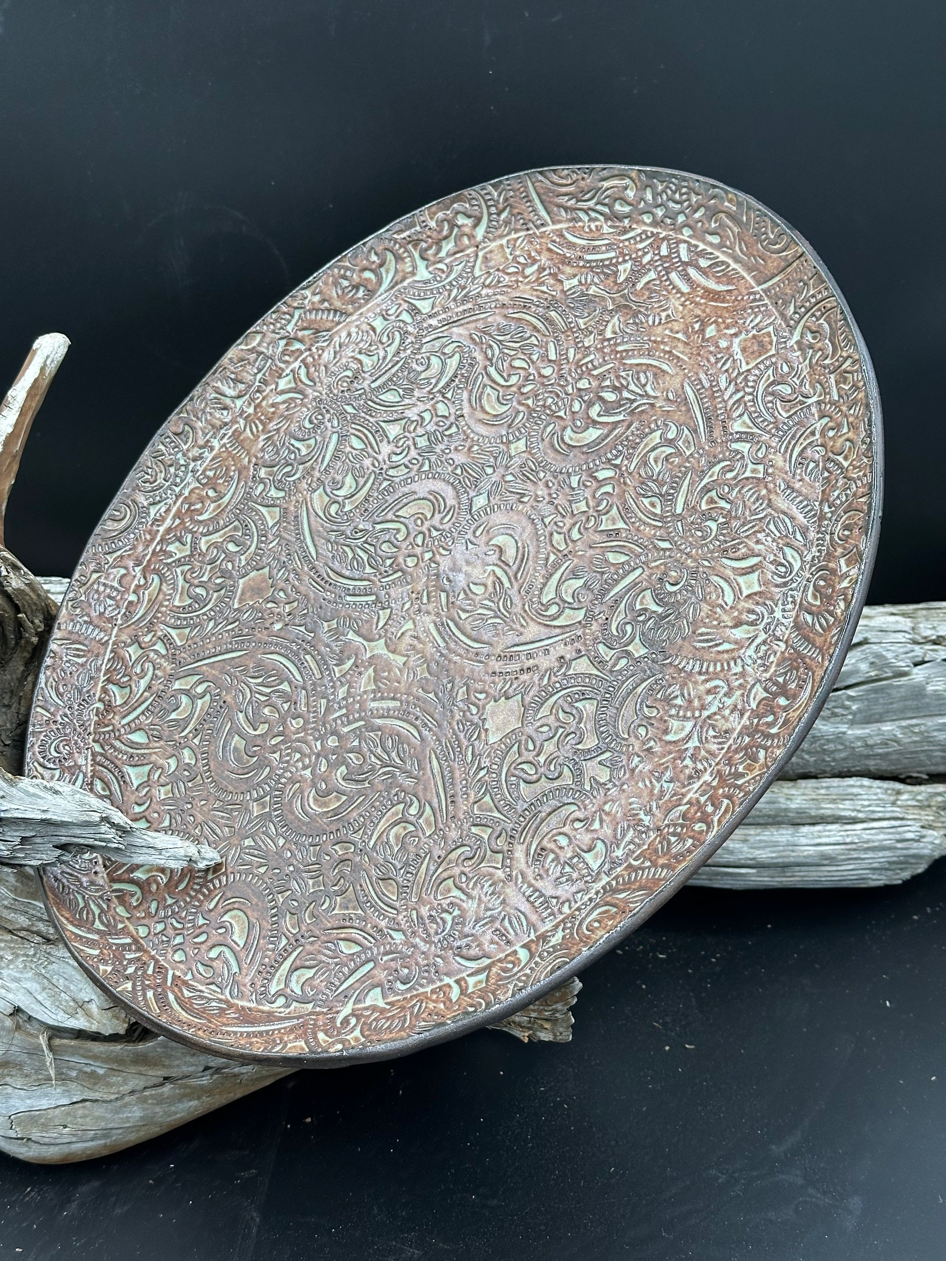 This rustic and elegant Large Serving Platter is a beautiful addition to any dining table. The sage green and brown textured design adds a touch of ornate charm, while the 12"x15" size offers ample space for serving dishes. Bring a touch of sophistication to your meals or entertaining with this stunning platter.