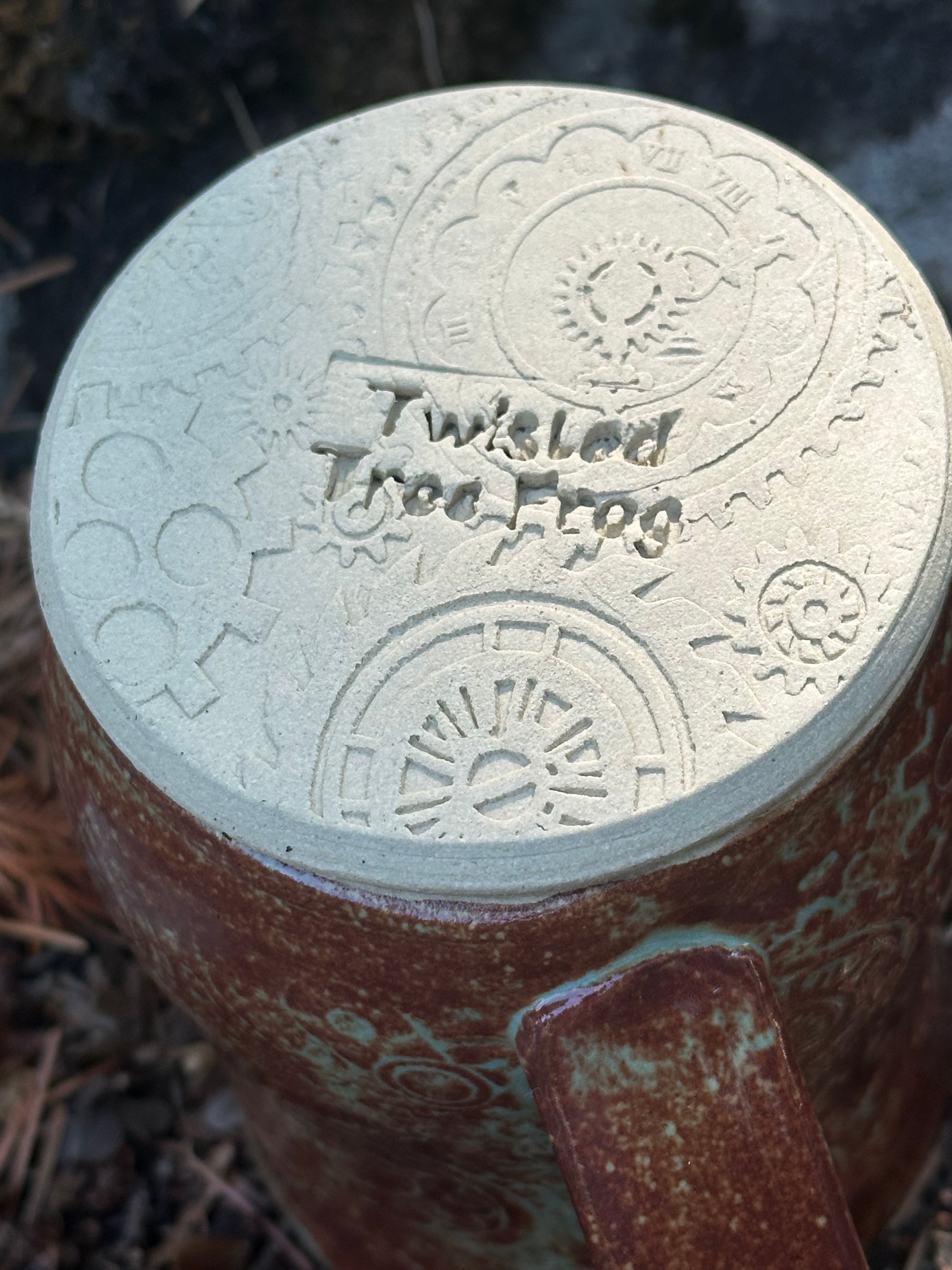 Brown with Green Steampunk Gears Pottery/Ceramic Mug approx. 16 oz. (250002)