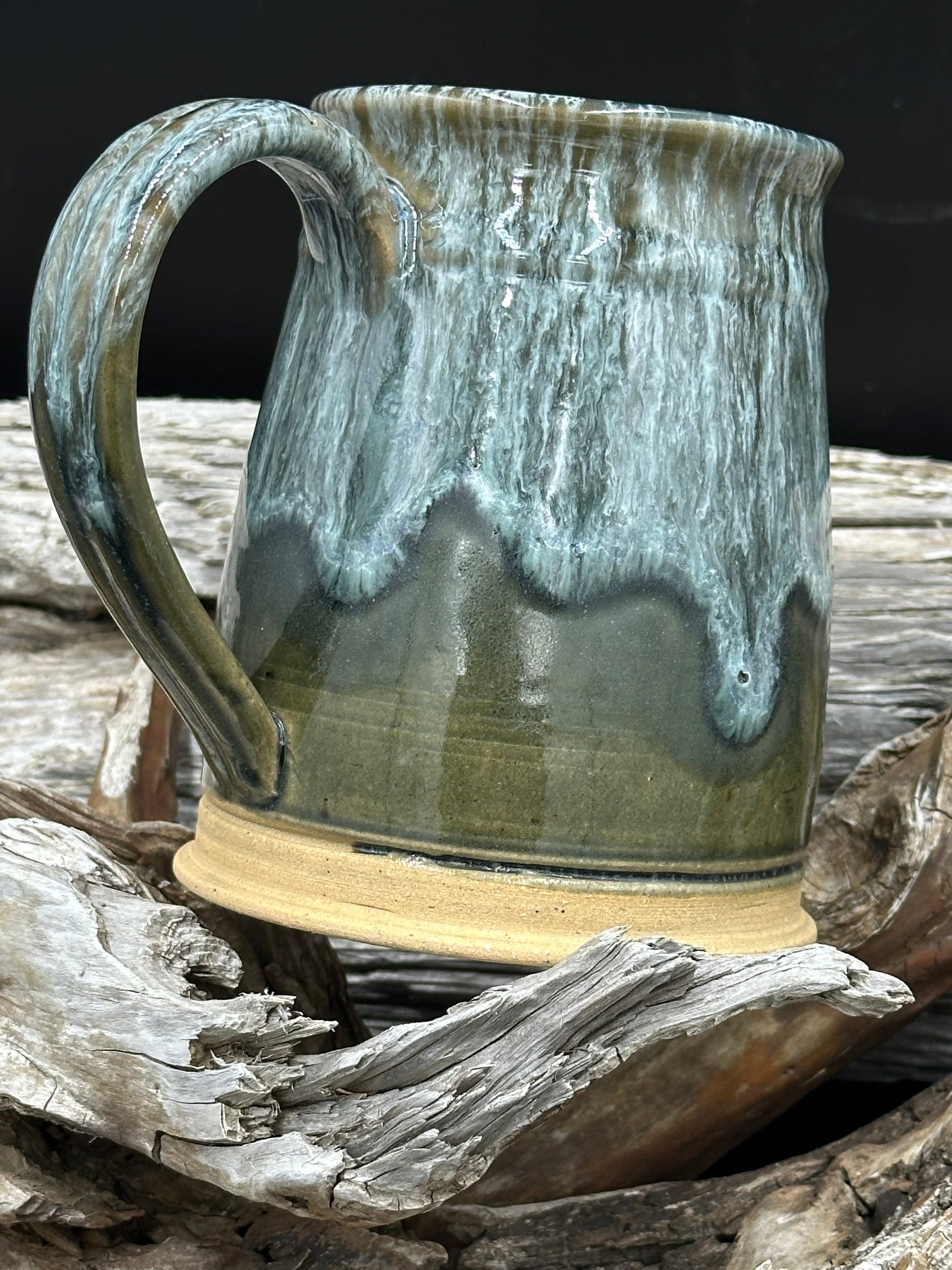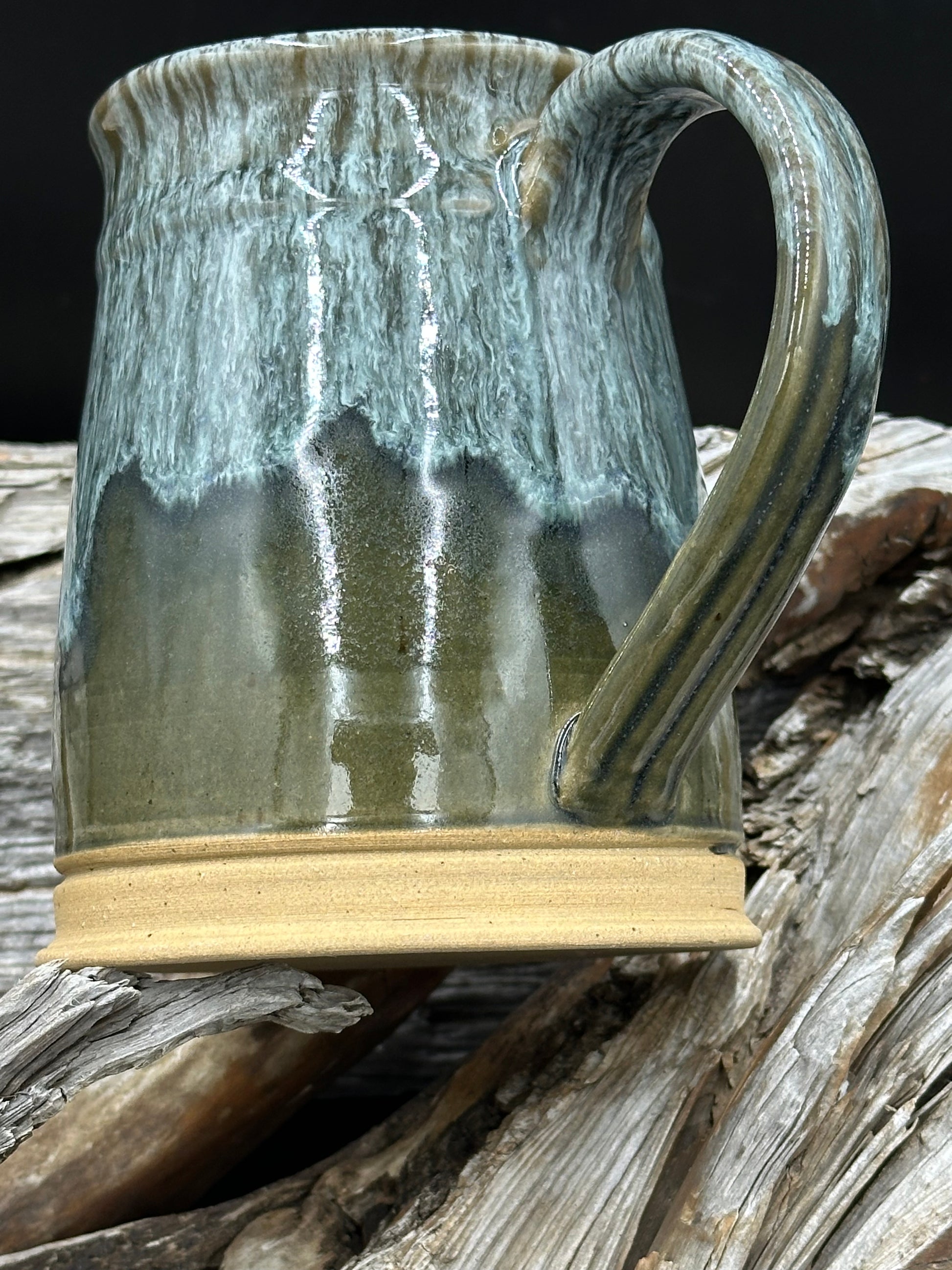 Handcrafted with food safe clay and glazed in a unique green gray color, this pottery tankard holds up to 24 ounces of your favorite beverage. Its classic shape and marbled design make it a stylish addition to any drinkware collection. Enjoy your drinks in style with this expertly crafted tankard.