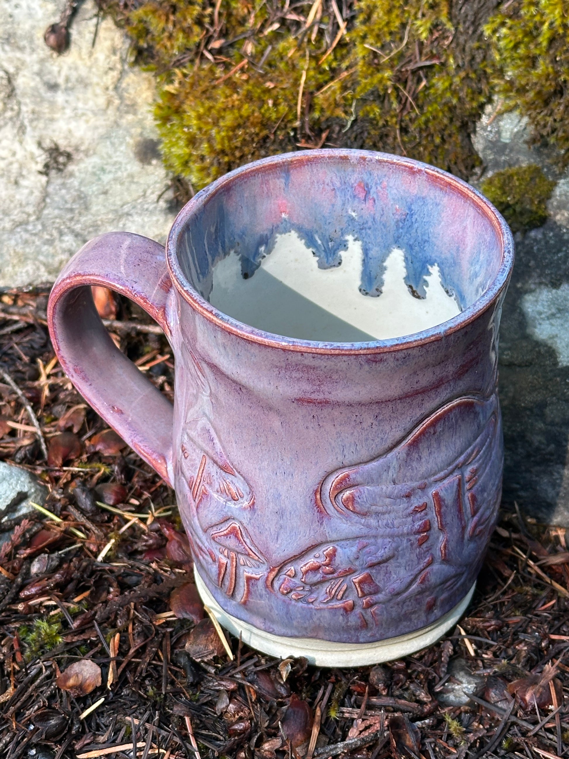 Handmade Pottery Mug - Mystical Mushrooms in Purple Whimsy (approx. 16 ounces)