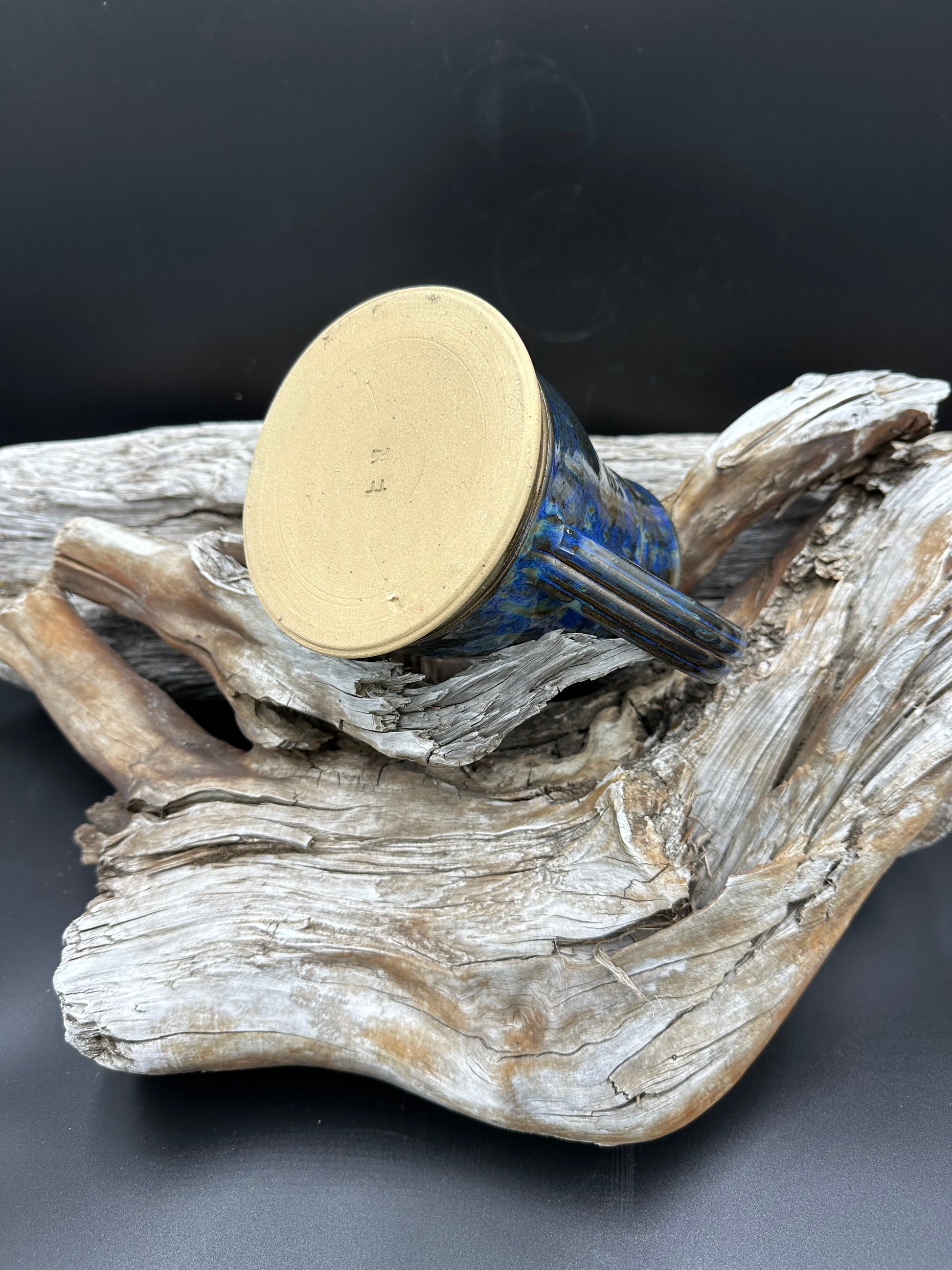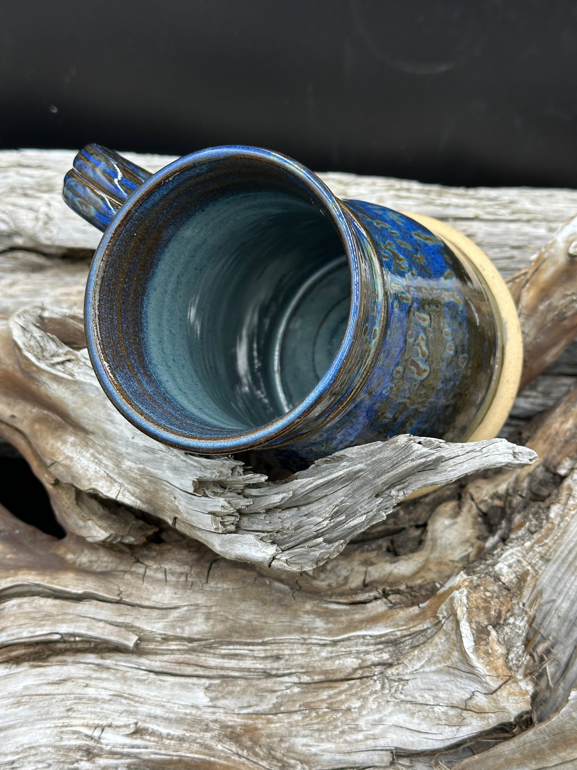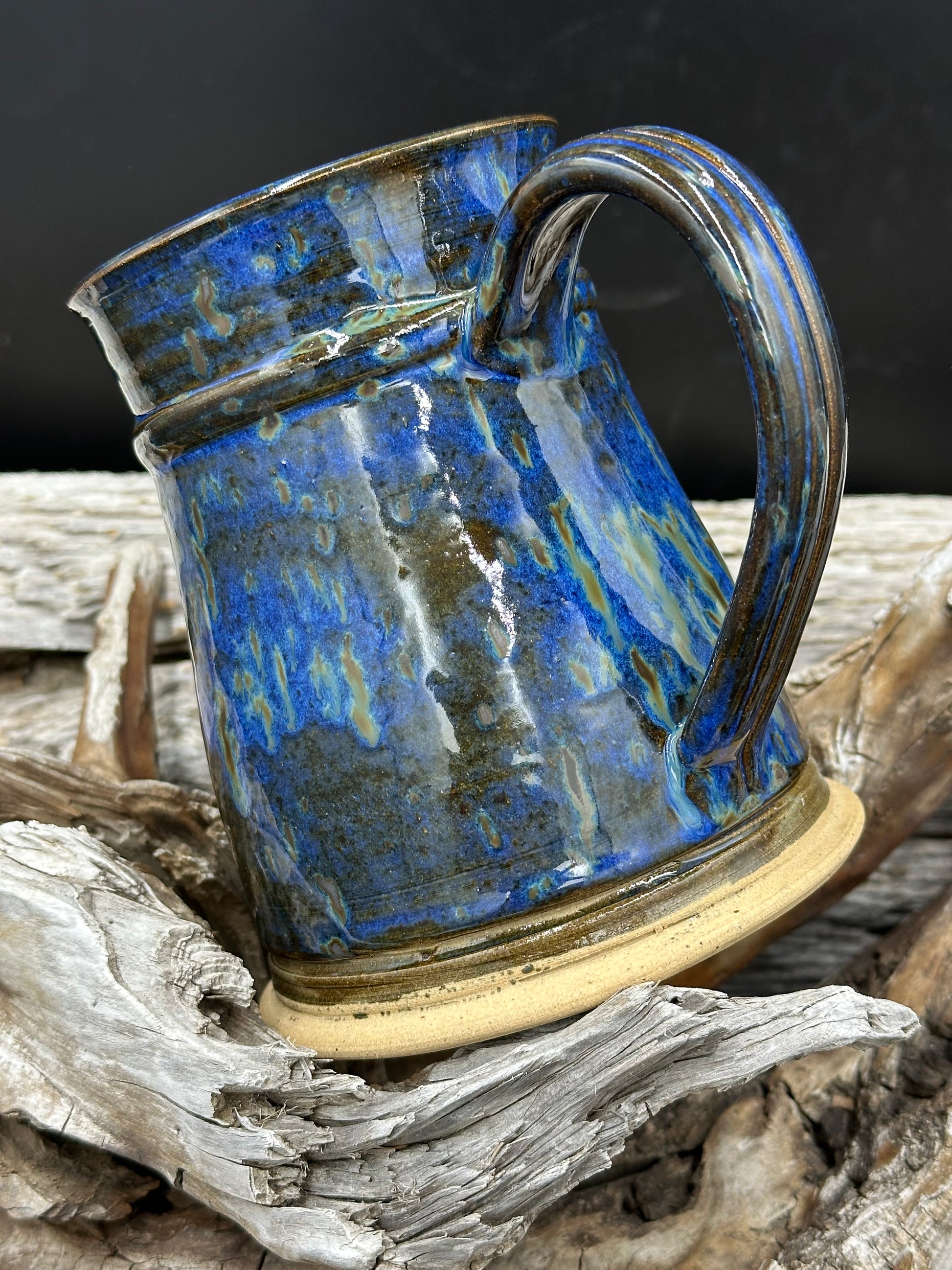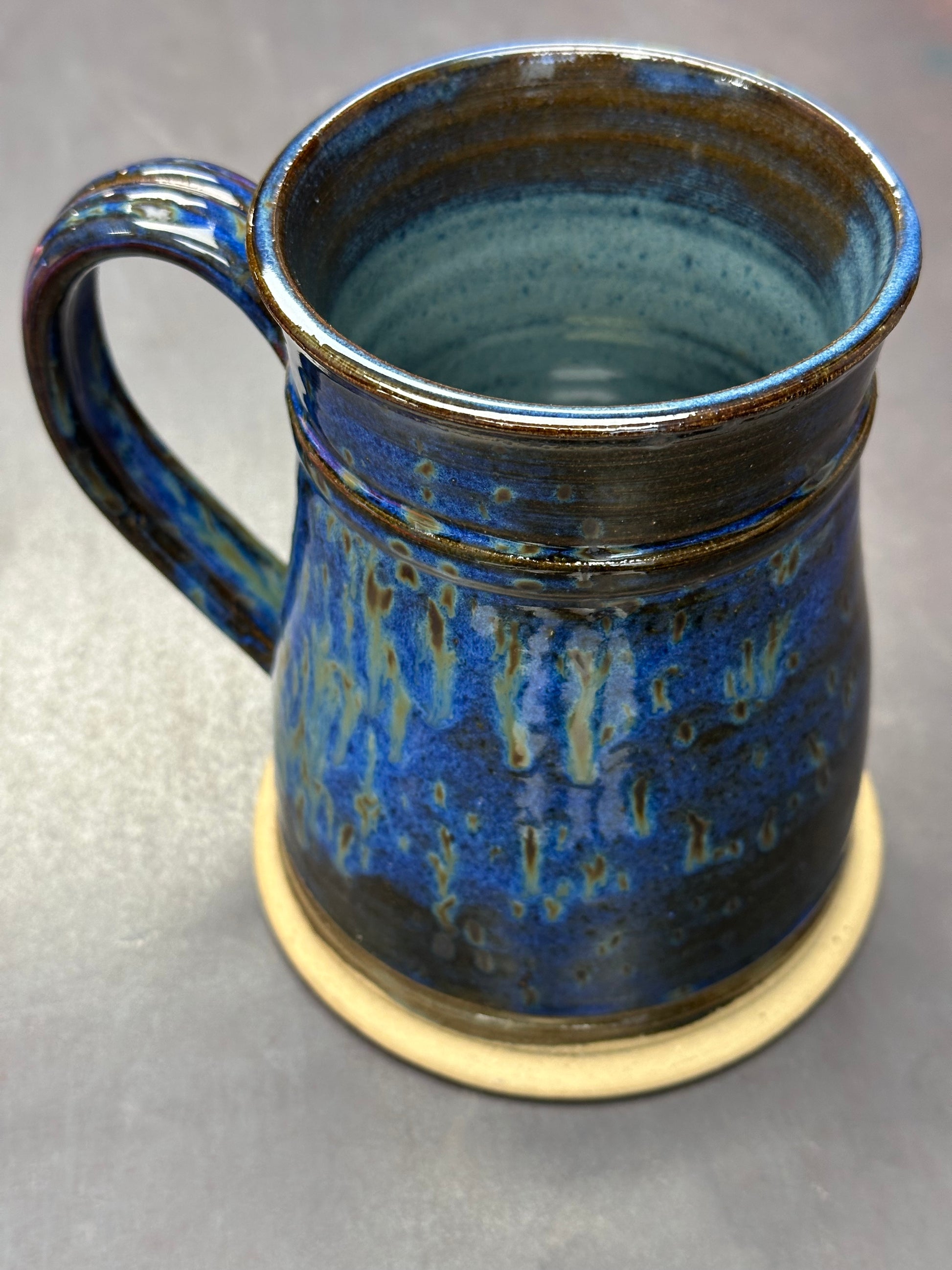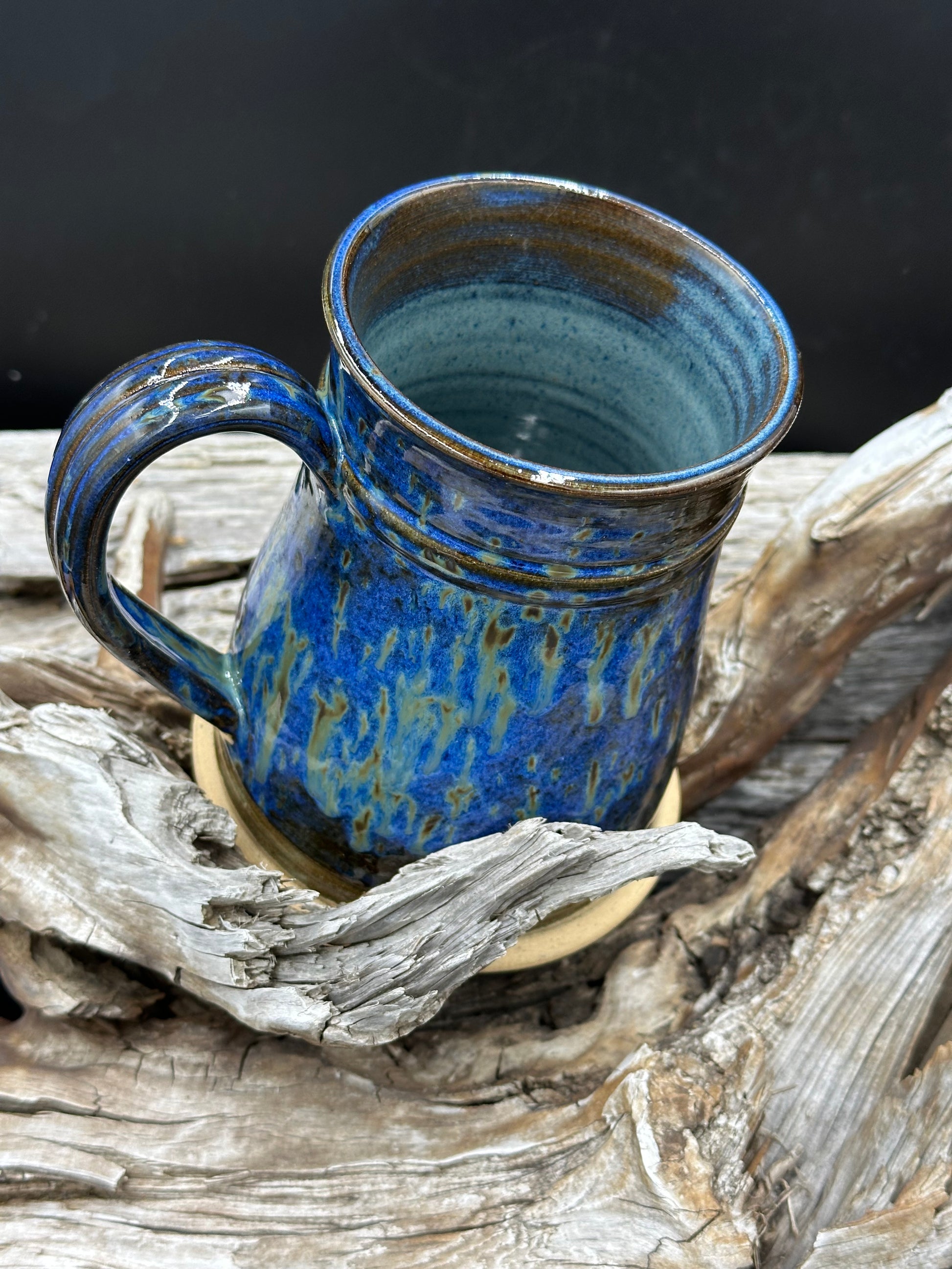 This tankard holds approximately 24 ounces and is crafted from food safe clay and glaze materials in a beautiful brown, blue, and green combination. Its design and materials make it both functional and visually appealing, perfect for enjoying your favorite beverage.