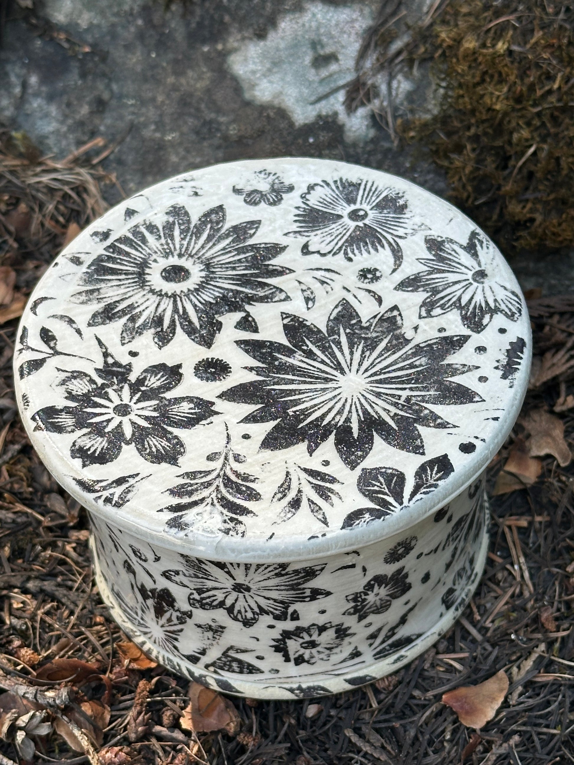 Pottery (Ceramic) White with Black Floral Design Butter Keeper